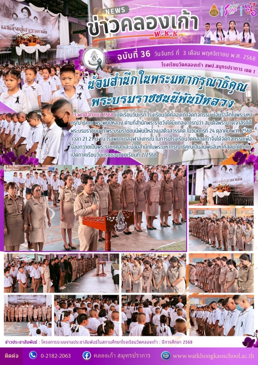 เปิดเรียนวันแรก โรงเรียนวัดคลองเก้าจัดกิจกรรม น้อมรำลึกในพระมหากรุณาธิคุณ พระพันปีหลวง ตามที่สำนักพระราชวังได้มีแถลงการณ์ว่า สมเด็จพระนางเจ้าสิริกิติ์ พระบรมราชินีนาถ พระบรมราชชนนีพันปีหลวง เสด็จสวรรคต ในวันศุกร์ที่ 24 ตุลาคม พ.ศ. 2568 เวลา 21.21 น. ณ โรงพยาบาลจุฬาลงกรณ์ ในการนี้โรงเรียนวัดคลองเก้าจึงได้จัดกิจกรรมเพื่อน้อมถวายเป็นพระราชกุศล และน้อมสำนึกในพระมหากรุณาธิคุณเป็นล้นพ้นอันหาที่สุดมิได้ ในวันเปิดภาคเรียนวันแรกของภาคเรียนที่ 2/2568  |